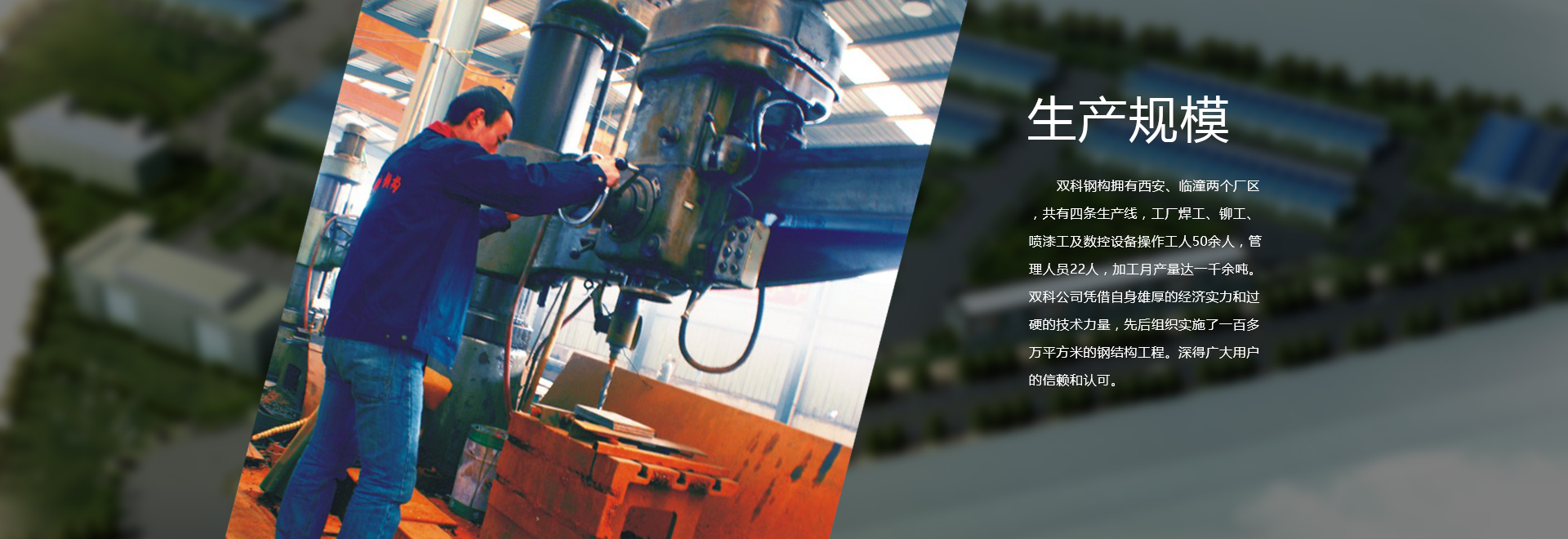 雙科鋼結構有限公司臨潼廠區,共有四條生產線,工廠焊工、鉚工、噴漆工及數控設備操作工人50余人,管理人員22人,加工月產量達一千余噸。雙科公司憑借自身雄厚的經濟實力和過硬的技術力…